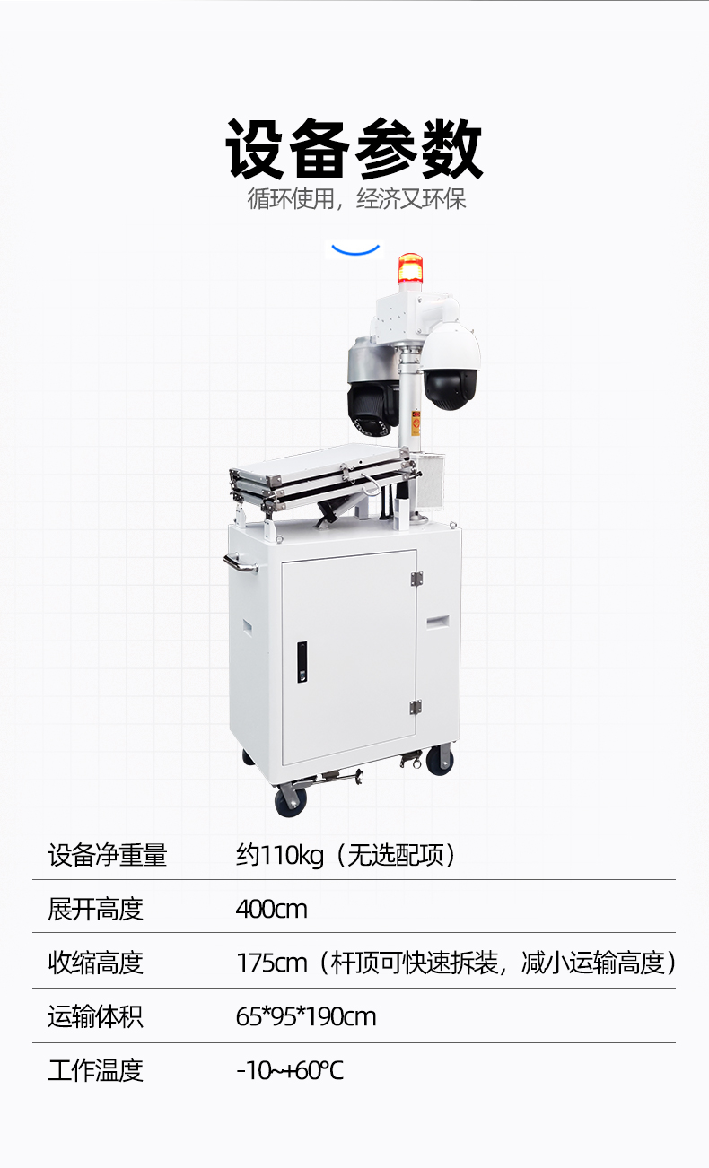 友聯(lián)哨兵多功能移動兵站-輕便型移動監(jiān)控 友聯(lián)哨兵多功能移動兵站(輕便型小哨兵移動監(jiān)控)是一款十分靈活的中小型移動監(jiān)控設(shè)備,自帶網(wǎng)電,具備較高的機動性,系統(tǒng)可集高清視頻監(jiān)控、照明、報警、廣播、對講、氣象環(huán)境監(jiān)測、存儲、控制、無線傳輸、一鍵升降等功能于一體,并可具備市電、太陽能等多種能源補給方式,提升續(xù)航時間,以適應(yīng)各類復(fù)雜的環(huán)境。戶外使用,不懼風(fēng)雨,隨需移動,循環(huán)利用??蓮V泛用于石油管道巡檢、工地監(jiān)控、電力維修監(jiān)控、活動安防、戶外作業(yè)等臨時監(jiān)控或長期監(jiān)控。