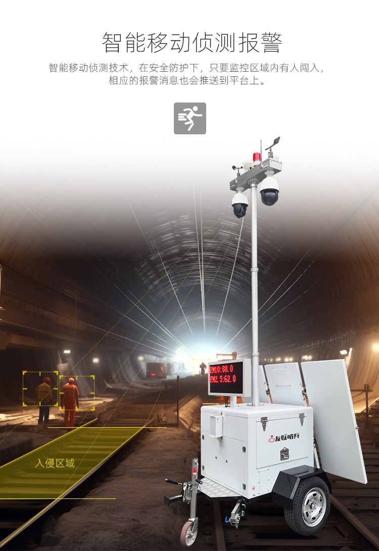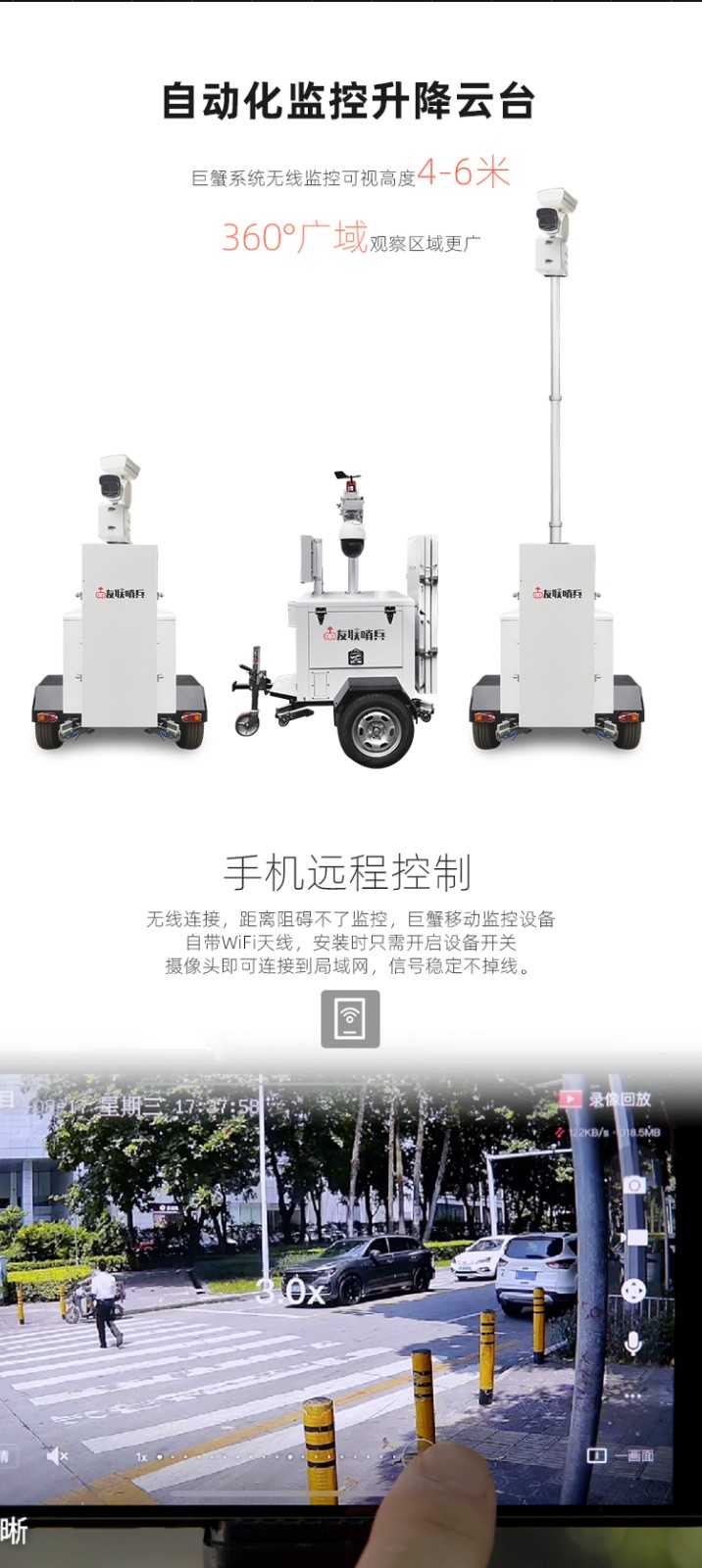 友聯(lián)哨兵巨蟹款太陽能供電工地?fù)P塵氣象監(jiān)測(cè)移動(dòng)監(jiān)控車(系統(tǒng)),自帶網(wǎng)電,具備較高的機(jī)動(dòng)性,系統(tǒng)可集高清視頻監(jiān)控、照明、報(bào)警、廣播、對(duì)講、氣象環(huán)境監(jiān)測(cè)(選配)、存儲(chǔ)、控制、無線傳輸、一鍵升降等功能于一體,并可具備市電、太陽能等多種能源補(bǔ)給方式,提升續(xù)航時(shí)間,以適應(yīng)各類復(fù)雜的環(huán)境。戶外使用,不懼風(fēng)雨。