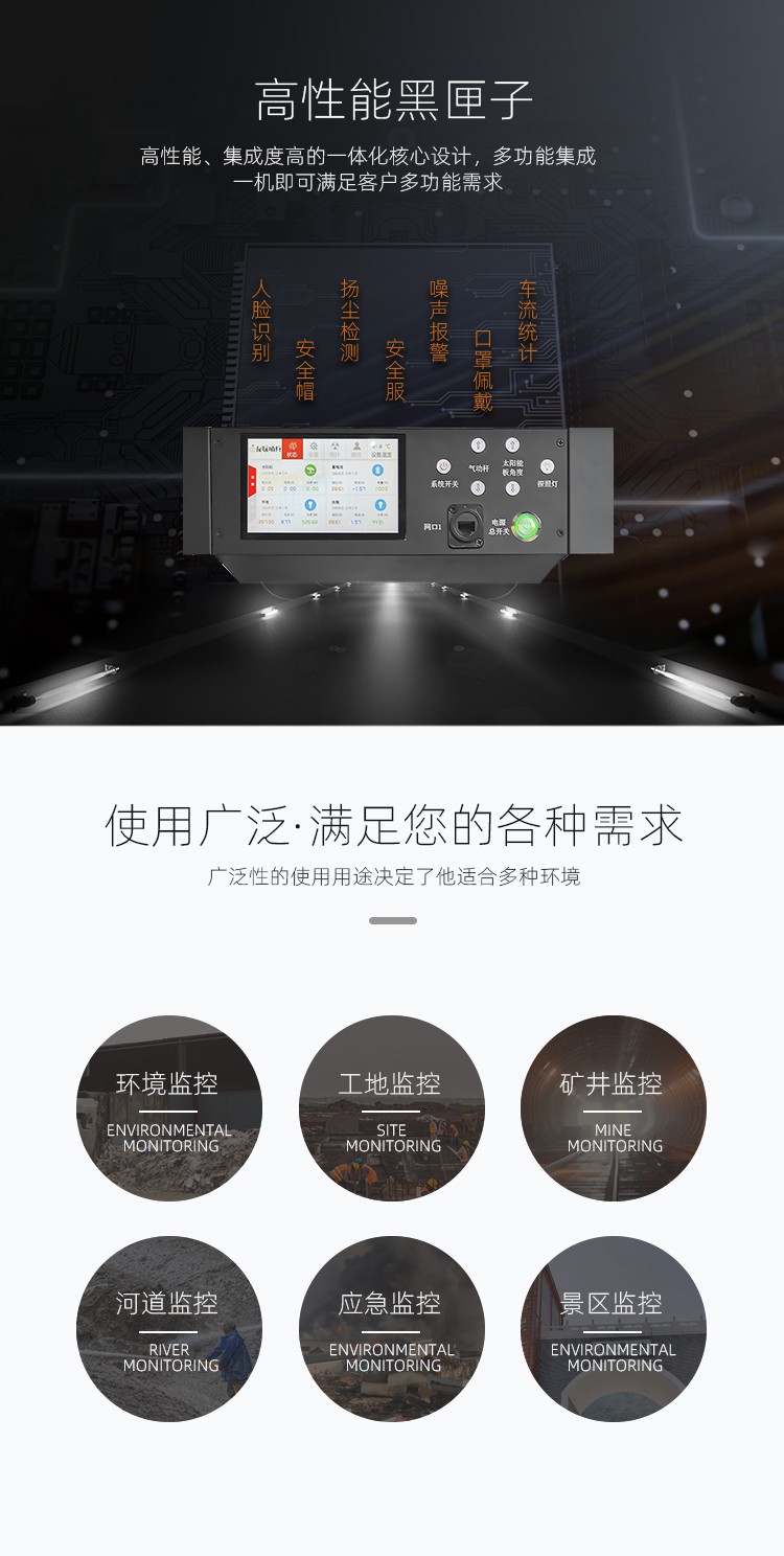 友聯(lián)哨兵風(fēng)光互補(bǔ)雙光熱成像移動(dòng)監(jiān)控系統(tǒng) ULS-FG-THER 友聯(lián)哨兵ULS-FG-THER風(fēng)光互補(bǔ)移動(dòng)監(jiān)控系統(tǒng),是我司推出的解決長(zhǎng)時(shí)間續(xù)航的智能移動(dòng)監(jiān)控設(shè)備,集雙光熱成像云臺(tái)接入、視頻監(jiān)控、升降、供電、控制、存儲(chǔ)和終端顯示于一體,可內(nèi)嵌AI深度學(xué)習(xí)算法,支持人臉識(shí)別、車牌識(shí)別、煙火識(shí)別、非法闖入等分析和處理,通過無線傳輸方式傳輸至指揮中心,由指揮中心對(duì)前端設(shè)備自由指揮調(diào)度及下發(fā)指令;該系列移動(dòng)監(jiān)控設(shè)備采用加厚金屬機(jī)身設(shè)計(jì),通用性及耐用性更強(qiáng);拖掛式運(yùn)輸轉(zhuǎn)場(chǎng)方式,滿足快速靈活部署需求;結(jié)合風(fēng)能、太陽能、蓄電池、市電等互補(bǔ)供電方式,無線網(wǎng)絡(luò)傳輸為主,無網(wǎng)無電的環(huán)境適用