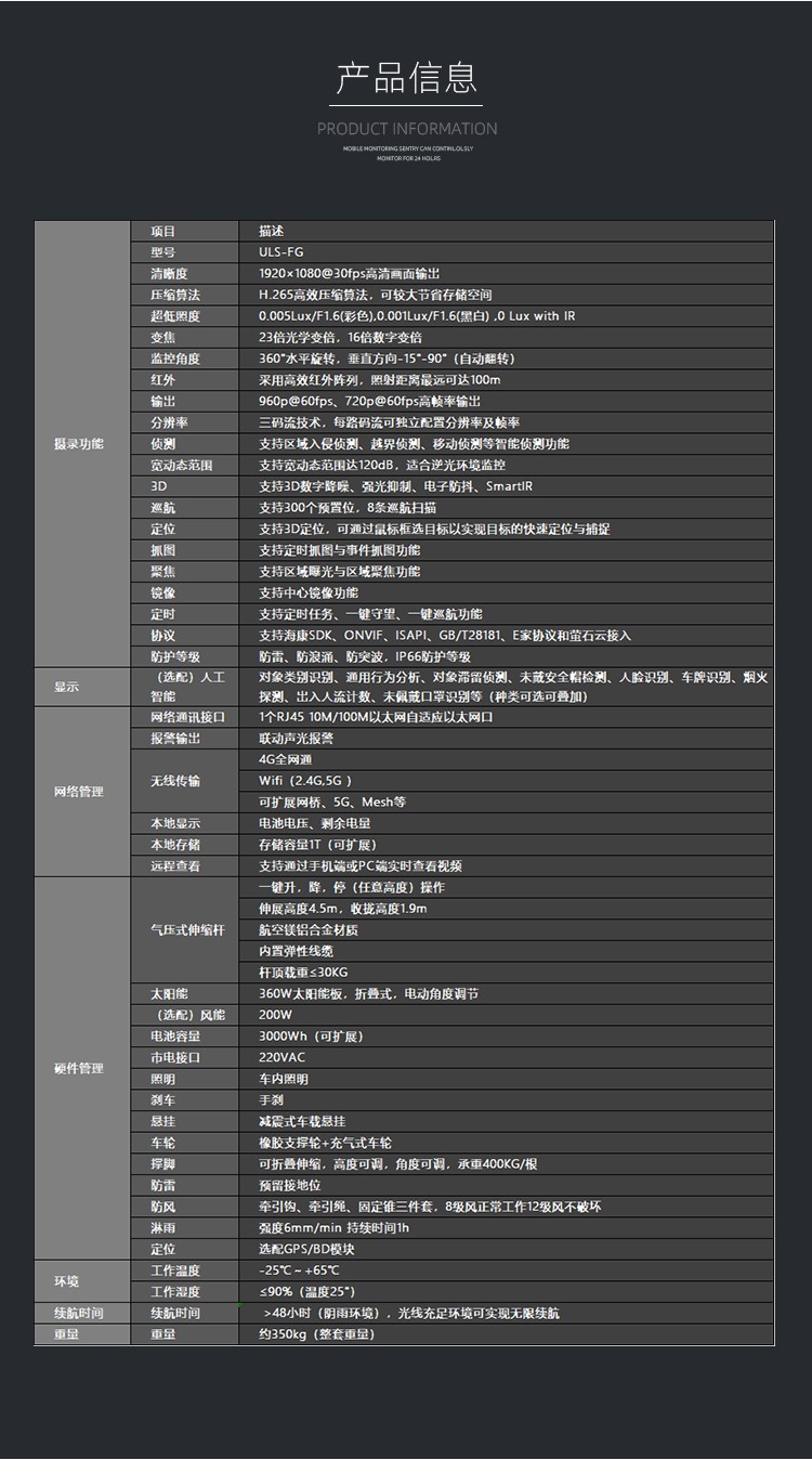 友聯(lián)哨兵雙目太陽能移動(dòng)監(jiān)控 ULS-FG 友聯(lián)哨兵ULS-FG系列太陽能移動(dòng)監(jiān)控系統(tǒng),采用加厚金屬機(jī)身設(shè)計(jì),集監(jiān)控、升降、供電、控制、存儲(chǔ)和終端顯示于一體,通用性及耐用性更強(qiáng);拖掛式運(yùn)輸轉(zhuǎn)場(chǎng)方式,滿足快速靈活部署需求;結(jié)合風(fēng)能、太陽能、蓄電池、市電等互補(bǔ)供電方式,無線網(wǎng)絡(luò)傳輸為主,無網(wǎng)無電的環(huán)境適用;搭載400萬360°無死角智能高清監(jiān)控?cái)z像機(jī),透霧性能強(qiáng),拍攝不受線和天氣影響;可加選AI功能,滿足客戶智能化識(shí)別需求。